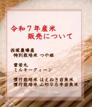 いつも西塚農場のお米をご購入頂き、本当にありがとうございます。 令和7年産米 販売中です!!ご検討宜しくお願い致します。注文が殺到した場合、販売を一時停止する場合がございます。 ご了承ください。 ※ご好評頂いておりました「おまけ米」のサービスにつきましては、令和7年産米から廃止致します。ご理解の程よろしくお願い致します。 ■西塚農場 Yahoo!ショッピング店 へ移動 ■西塚農場 楽天市場 店 へ移動 【特別栽培米】 ■特別栽培米 つや姫 3営業日以内に順次発送 【慣行栽培米】 ■はえぬき 3営業日以内に順次発送 ■山形95号 3営業日以内に順次発送 ■雪若丸 3営業日以内に順次発送 ■ミルキークィーン 3営業日以内に順次発送 ![]() ◆ふるさと納税の返礼品として、 ◆ ◆商品をお届することができます。◆ |